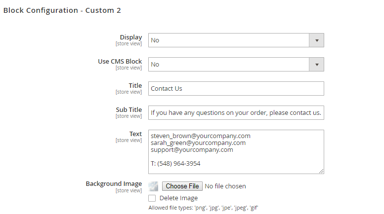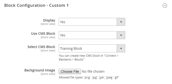 If your custom block doesn’t contain CMS block, specify the Title, Sub Title,Text and upload a Background Image if needed.