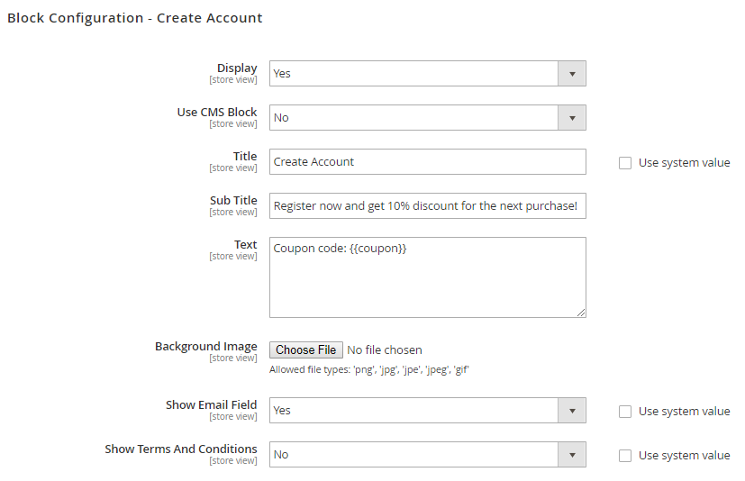 Set Use CMS Block option to Yes if you want to add a CMS block. If enabled, choose the CMS block. If No, specify the Title, Sub Title and Text for ‘Create Account’ block. Upload Background Image to customize block background.