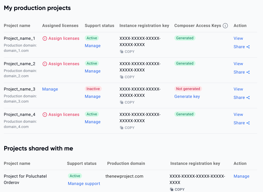 In License Registration → My Production Projects / Projects Shared with Me, there is a new column that displays the current state of support for this project.
