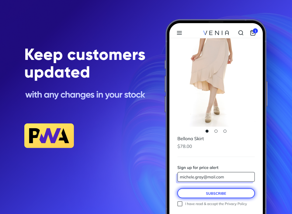 This add-on is a ready-to-use solution for the PWA Studio storefront, supporting features of the original Magento 2 Out Of Stock Notification extension. Please keep in mind that for the correct work of the add-on the original extension and a PWA theme must be installed. Learn more in our PWA installation User Guide.