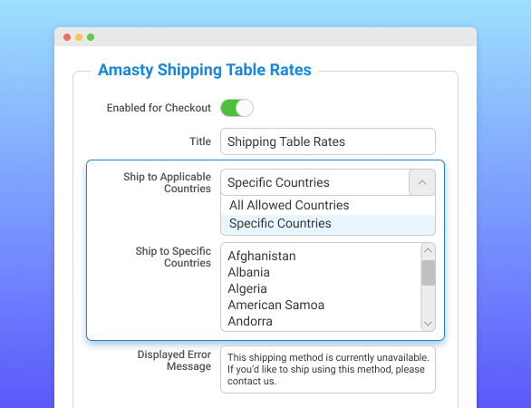 You can create Magento 2 custom shipping methods and rates via the flexible settings of the Shipping Suite solution. Define shipping area, weight and price limitation, type of shipping method, and specify stores and customer groups for created methods or rates to make your shipping strategy more efficient.