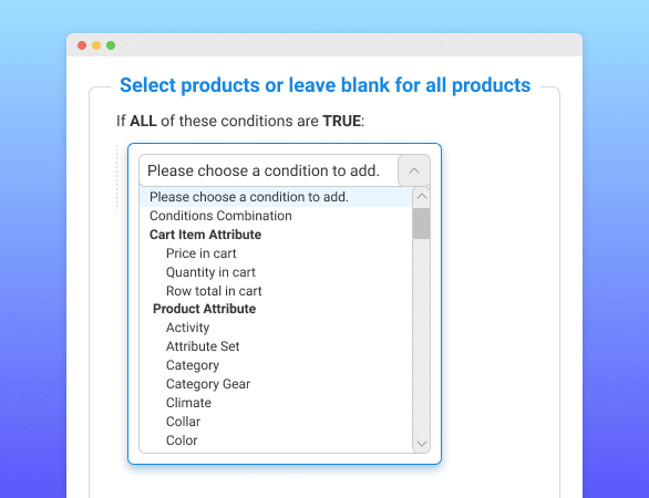 Set rules or restrictions separately or simultaneously combining different attributes (order, product, customer, geo) in one condition.