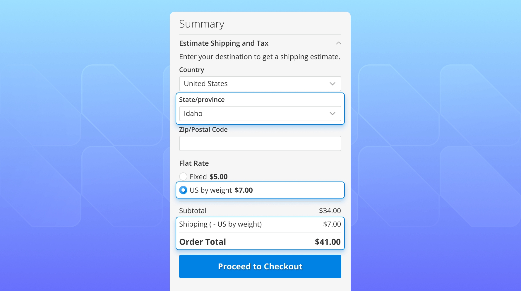 The built-in Magento 2 distance-based shipping calculator tool lets you calculate costs , order subtotal, weight, and price. Therefore, you can combine the necessary parameters to create shipping rates according to your needs. For example, you can set multiple flat rates for Magento 2 shipping, e.g. a $5 cost for orders which weight from 5 to 10 pounds and cost between $15 and $75 when 5 or fewer items are added to cart.